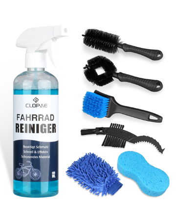 CLOPAE Bicycle Cleaning Kit: 7-in-1 bicycle cleaning set includes bicycle cleaning 500 ml, sponge, wheel brushes, chain brush x 3. The products are all easy to use and work excellently.