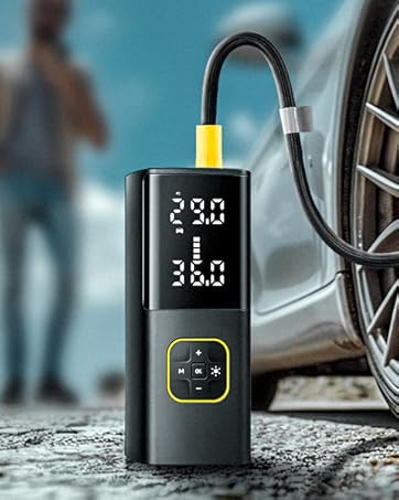 【3X Faster Tyre Inflation】With 120w/12v powerful copper motor, our portable car inflator can fill a small car tire (29-36PSI, 195/65R15) in just 1 minute, or fully inflate it in just 6 minutes. Built-in 9000mAh lithium rechargeable battery, can inflate up to 24 tires (29-36 PSI, 195/65/R15) on a single charge. It‘s a truly compact monster that can handle a wide range of inflation tasks.